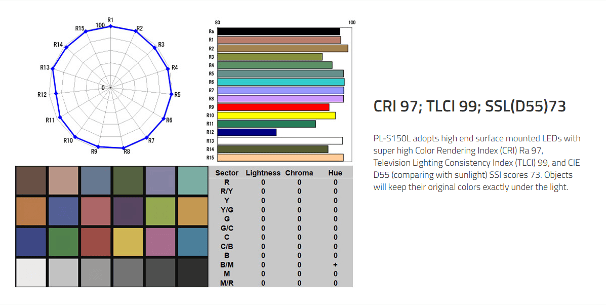 › Color rendering CRI 97, TLCI 99, SSI(D55)73