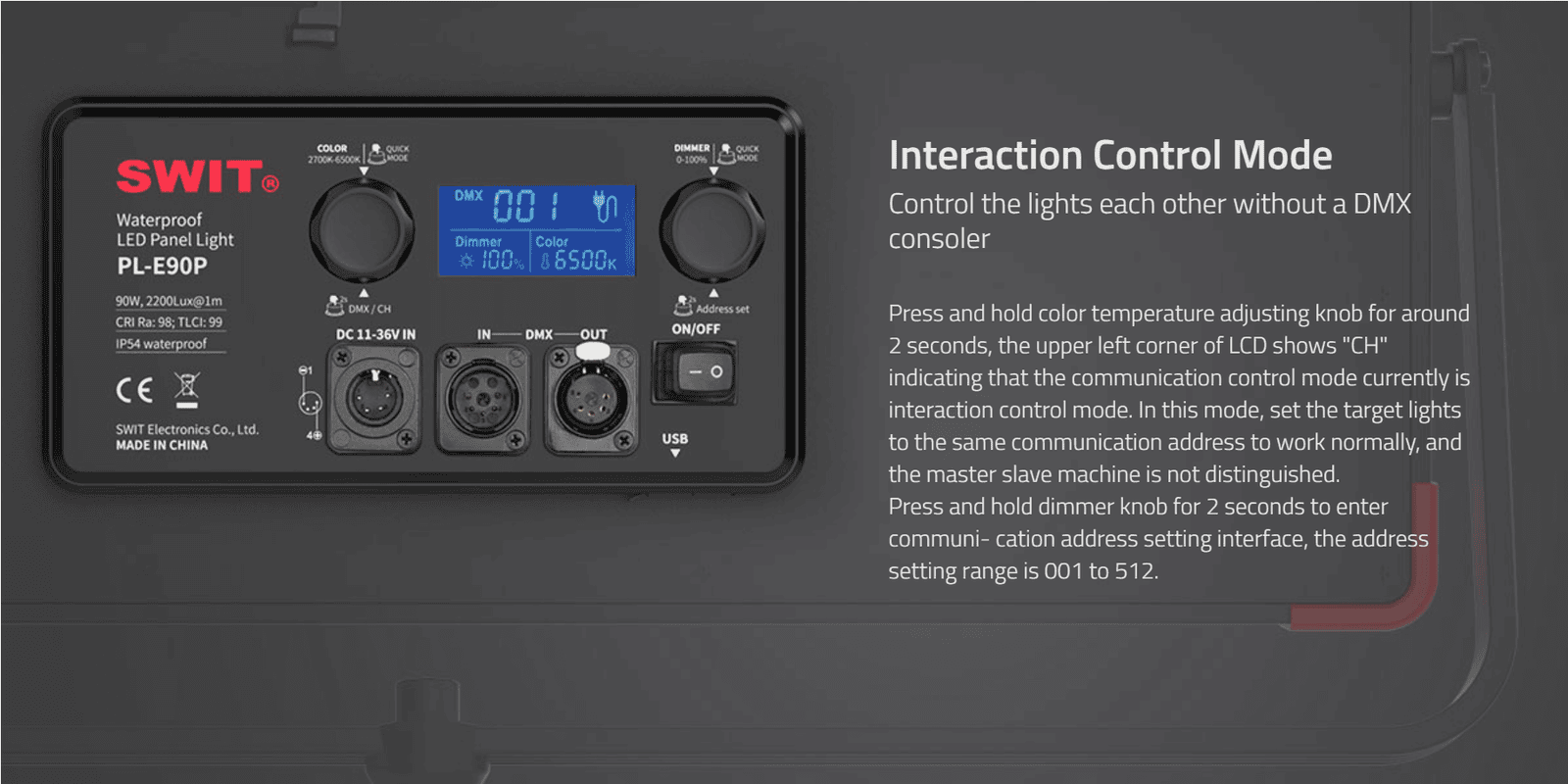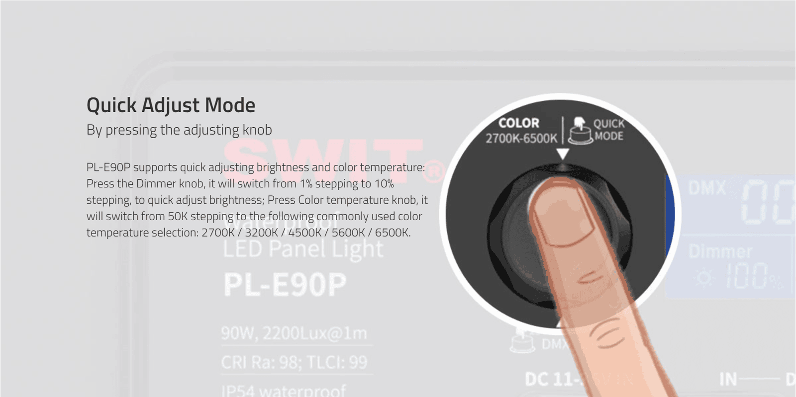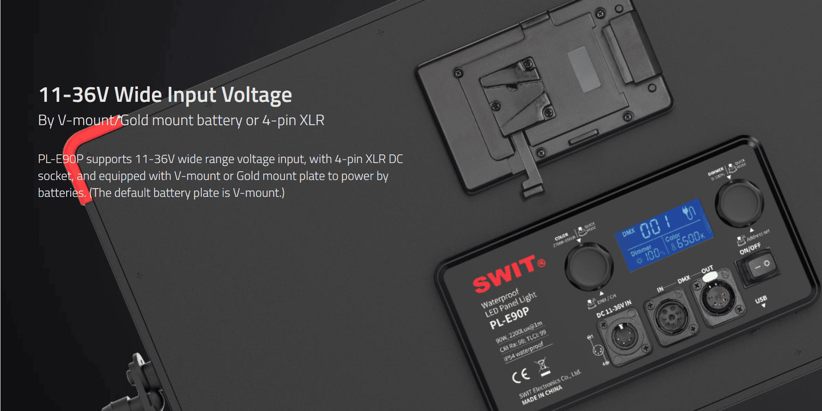 IP54 WATER PROOF 3rd Generation Natural-born-soft Bi-color LED Panel Light, ultra slim, SWIT patent, CRI 98, TLCI 99, DMX support, 90W, 2200Lux@1m, stable brightness even battery power is few, 0-100% flick-free dimming, 2700K-6500K continuous, wide input DC 11-26V, 70°effective wide beam angle, 480pcs SMD LEDs, V-Mount