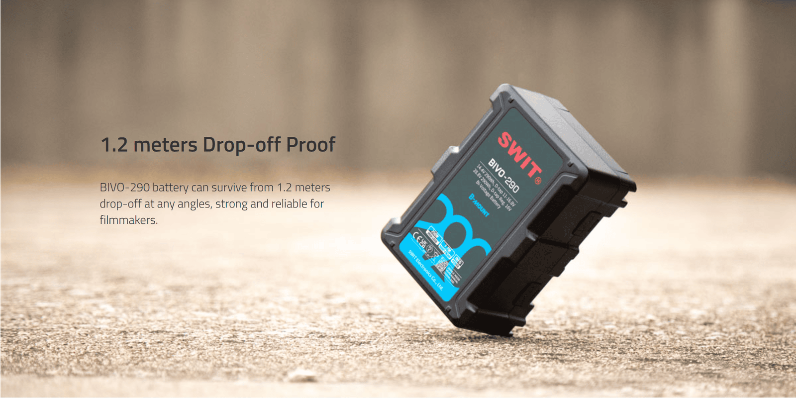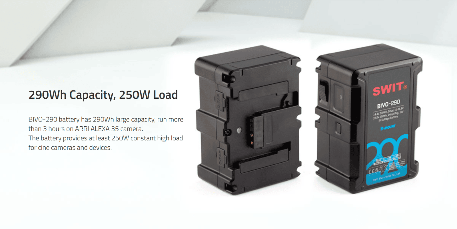 290Wh Battery with 14.4V/28.8V B-Mount(21.6-33.6V) and 16V D-tap, USB-C, USB-A Power info on SONY/RED; 1xD-tap always output normal voltage; 250W stable output; Only 3 hours with 6A fast charging (by SWIT PC-P460B); LED indicators; >1.5m Drop-Off really tested; Multiple circuits and peak-current protections