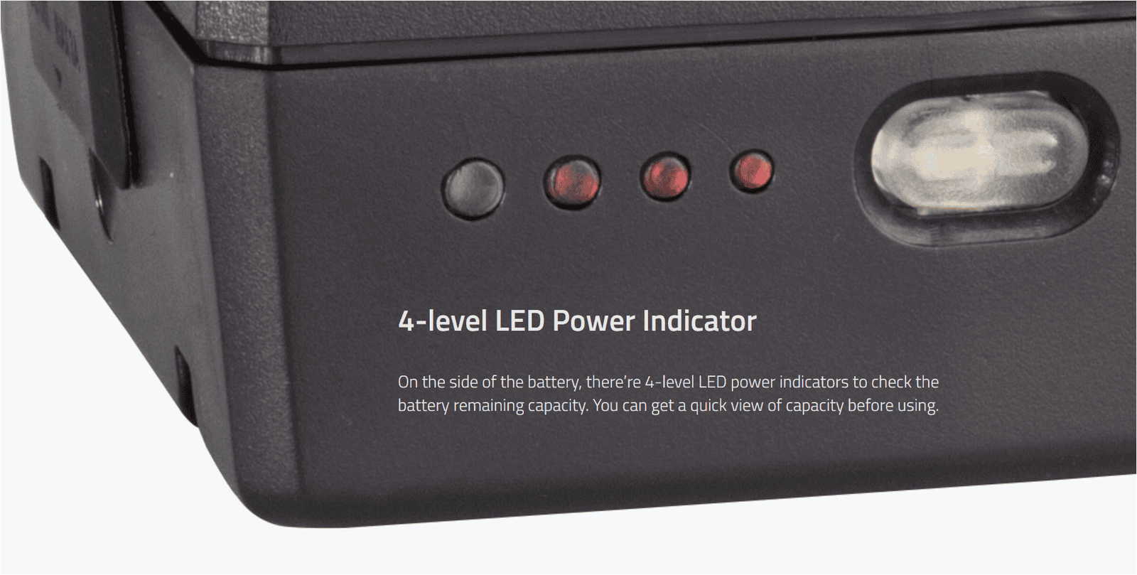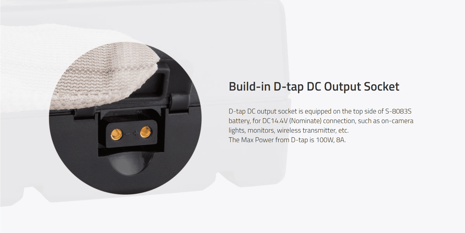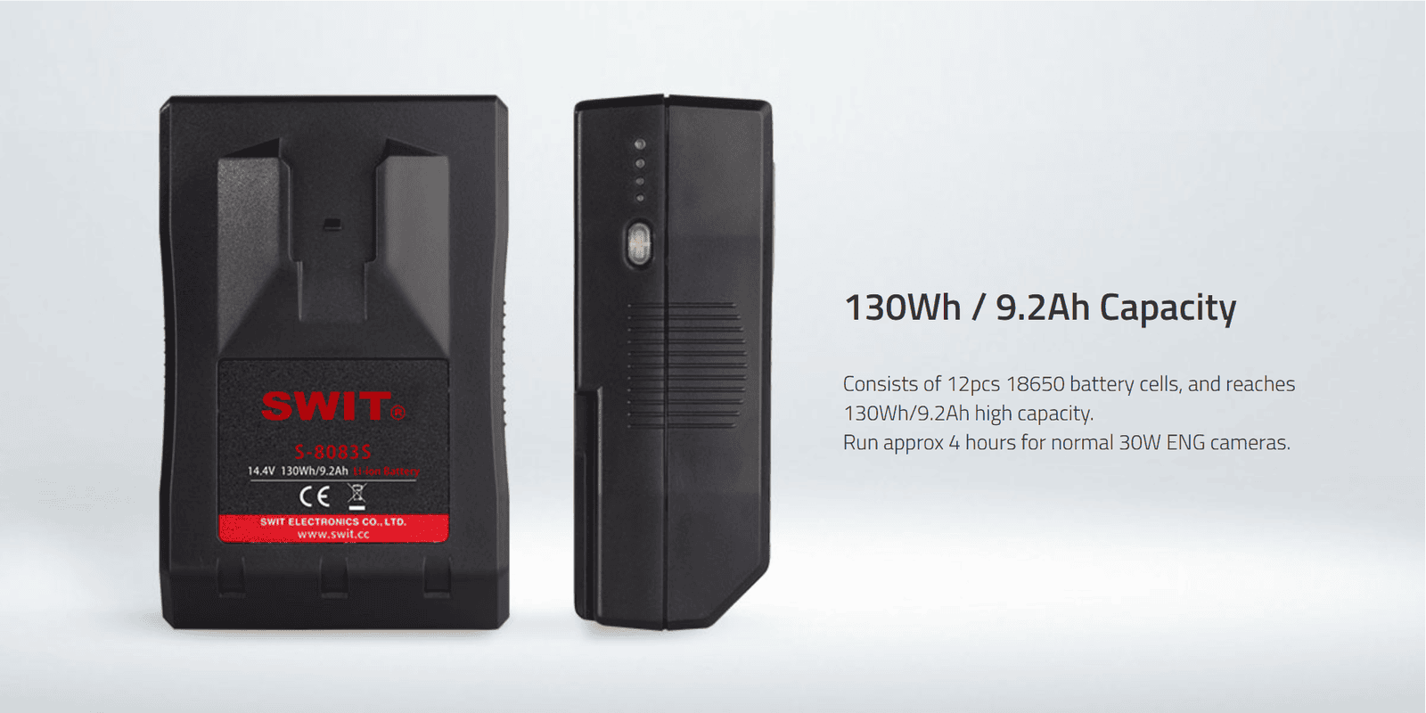 High Load; SWIT Exclusive Quality; Also especially ideal for long term use on high power draw lights with max stable output 200W/16A; 130Wh; 3A fast charging; 1xD-tap in/output; 4-LED indicators; Multiple peak-current protections; 14.4V V-mount