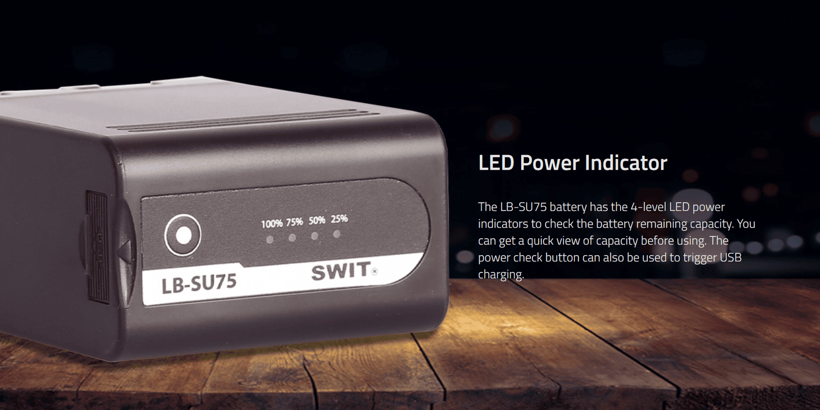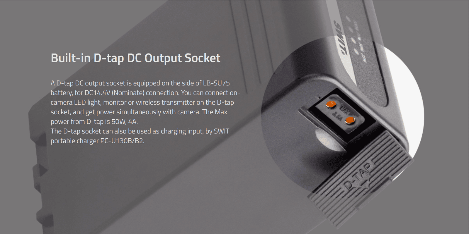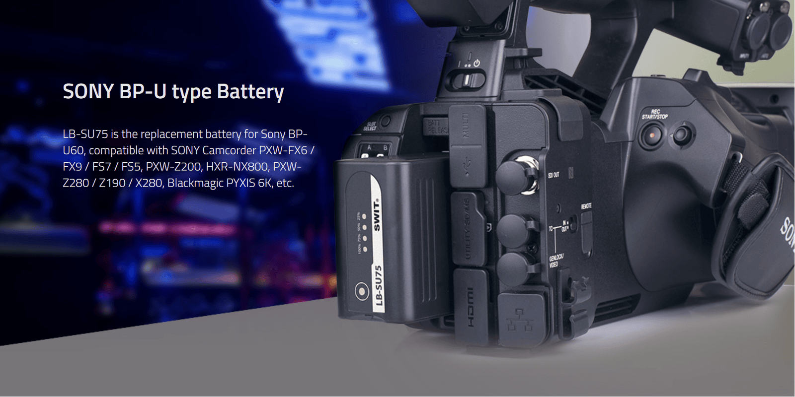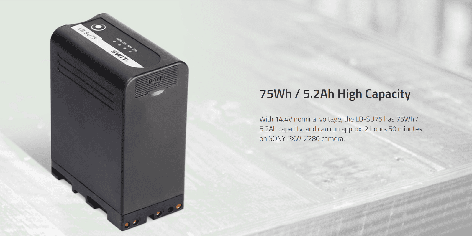 75Wh/5.2Ah U-type DV battery ◆SWIT Exclusive Quality, ◆D-tap output, USB output, ◆perfectly for new Sony PXW-Z190/Z280, comparable to Sony BP-U, with Power info on camera, 4LED indicator, multiple circuit protection