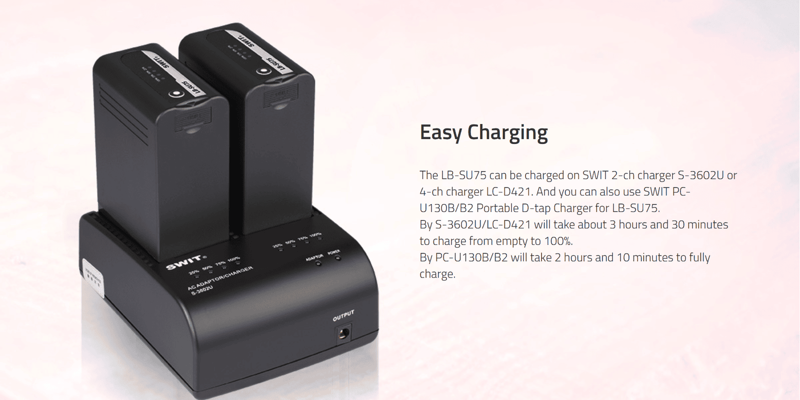 | LB-SU98 LB-SU75 | 1)SONY FX6 2)SONY PXW-Z280/Z190 3)SONY PXW-FS7 4)SONY PXW-FS5 5)SONY PXW-X280 6)Can't use on PXW-X160/X180 7)Can't use on PMW-300/EX1/1R,EX160/280,EX3/F3, FS7 MARK II | SONY BP-U90/60/30 SONY BP-U35/70 | LC-D421(+ KA-C10U) PC-U130B/B2 S-3602U | Can't use on sony original chargers and 3rd-party chargers | 14.4V |