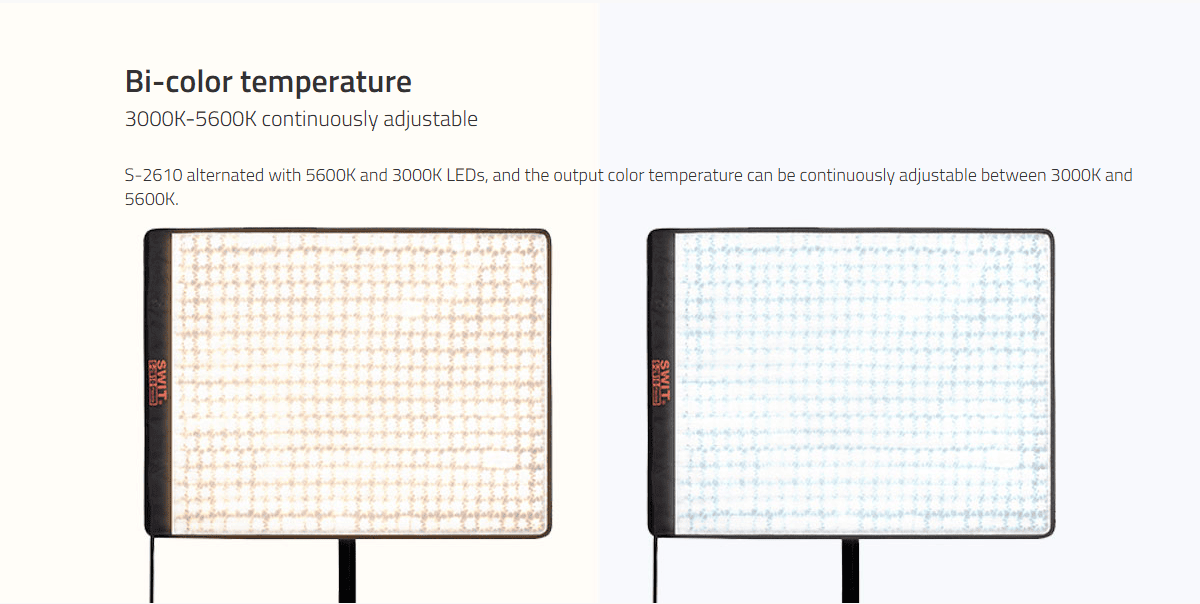 ◆100W power, 2400Lux@1m ◆Flexible 10°-360° lighting ◆Water proof fabric ◆Ultra bright SMD LEDs ◆3000K-5600K continuous adjust ◆0-100% flick-free dimming ◆CRI Ra≥97, TLCI≥97 ◆LCD Touch Screen Controller ◆2.4G wireless cascading control ◆Portable X bracket for tripod ◆DC / V-mount 11-17V input