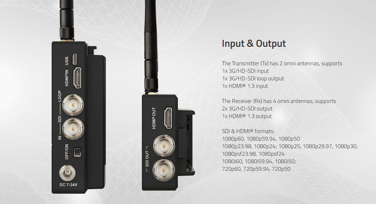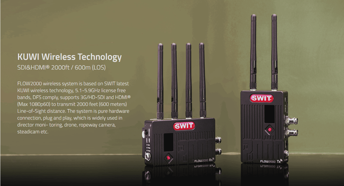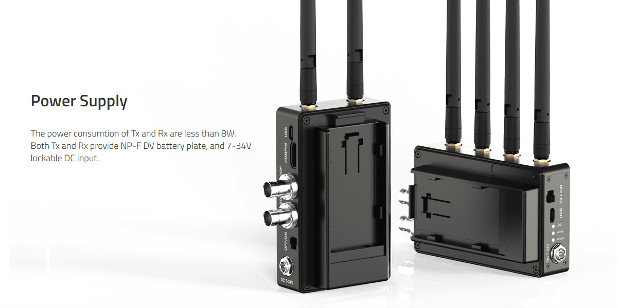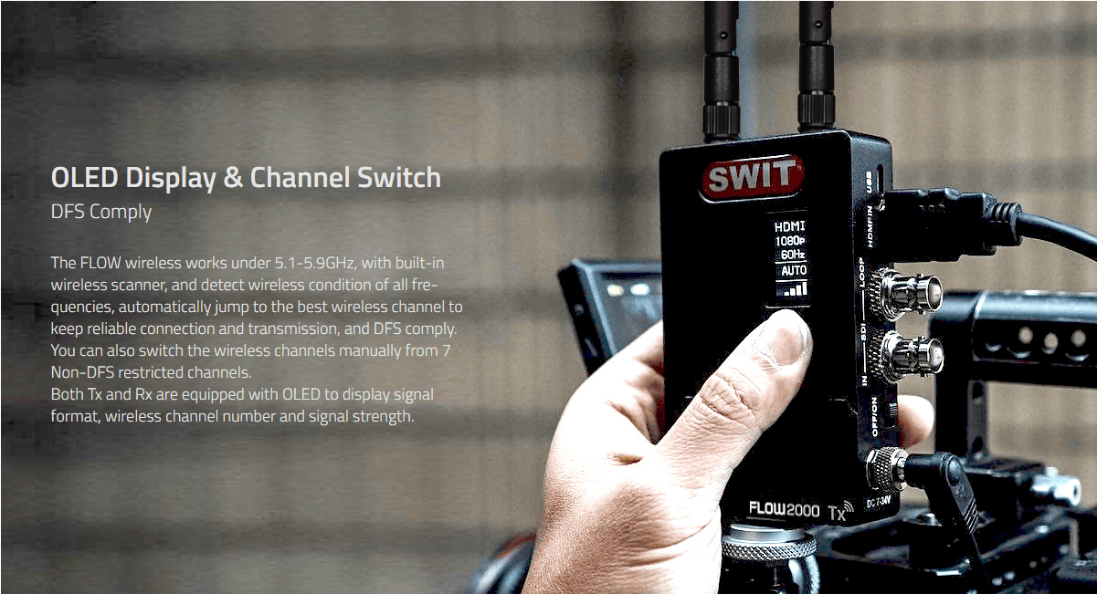 New generation wireless by SWIT unique technology: ◆2000feet(>600m) FHD Video 1 Transmitter with 2 Receivers, full DFS-Comply; ◆Much more robust and smooth connection with higher quality picture even in very complex wireless environment; Much stronger anti-interference ability; ◆Much longer practical distance; Stronger Wall-through; ◆Much smaller! Robust with Aluminum housing; ◆No signal loss, accurate color and clock reproduction(algorithm by SWIT); ◆Completely quiet; No fan; ◆No delay with ~~0.03s stable and invisible latency; Much better than Wifi solution; ◆OLED display on both Tx&Rx for visibility and best channel selection; ◆Auto or Manual Pairing(All under your control), both DFS-Comply; ◆SDIx2+HDMI on both Tx&Rx; ◆Chip-level Content Encryption; ◆16-ch Audio, Timecode & Trigger; ◆No-stop Replay for Alexa Mini; ◆Support max 22 pairs in one location, 1Tx to 20+ Rx Multicast; ◆Tx&Rx wide range DC in; Tx&Rx: NP-F mount