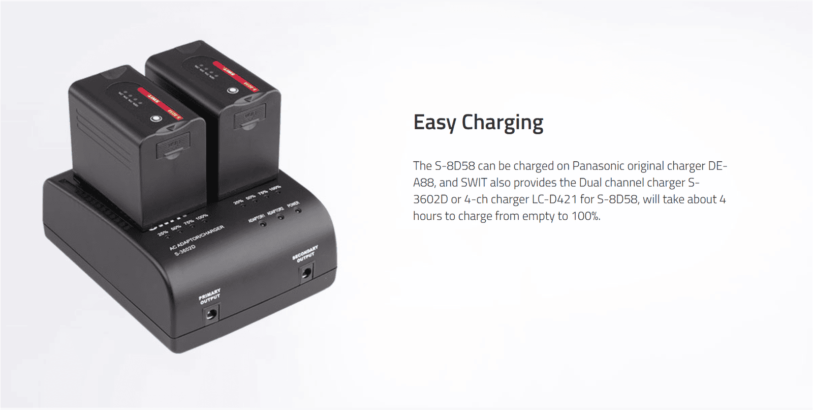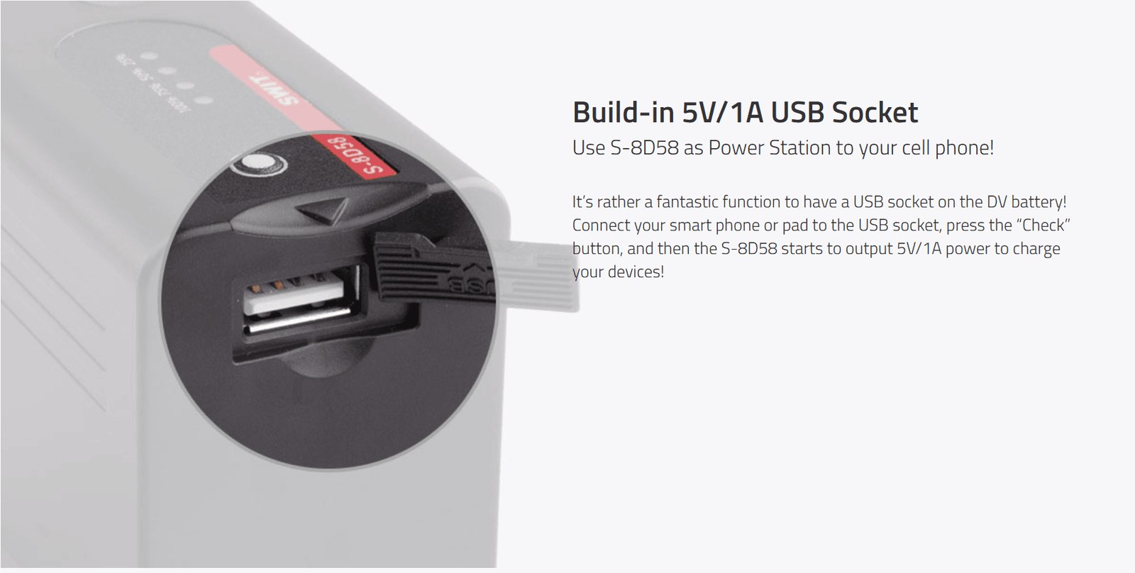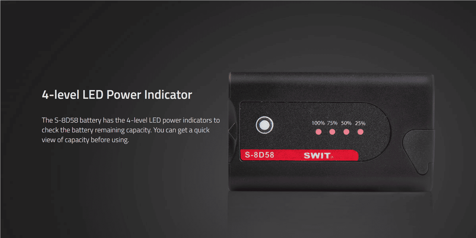 43Wh/6Ah D-type DV battery ◆SWIT Exclusive Quality ◆Pole-tap DC input/output ◆USB output ◆4LED indicator ◆Multiple circuit protection ◆comparable to Panasonic VW-VBD58, AG-VBR59