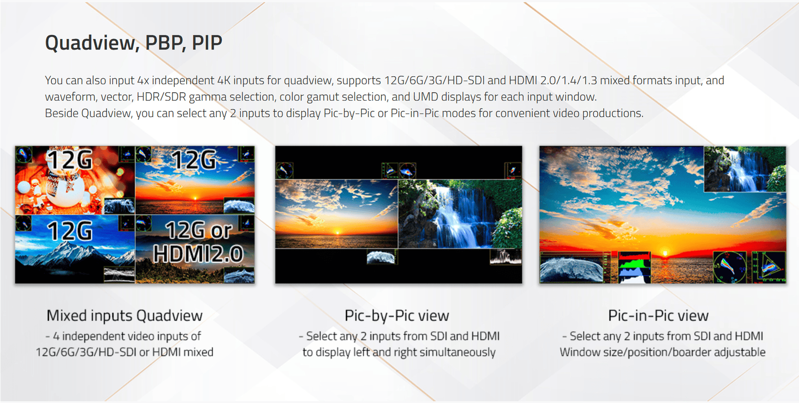 › 4 inputs Quadview, any 2 inputs PBP/PIP view